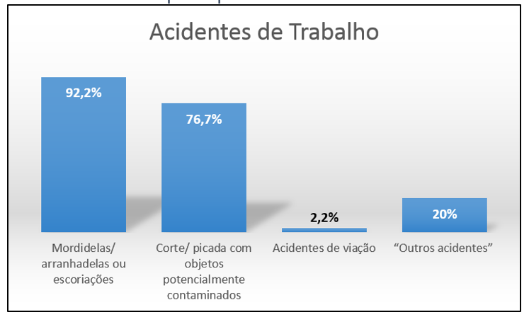 Resumindo uma revisão bibliográfica efetuada por uma das autoras destes trabalho, pode-se salientar, por exemplo, um estudo Australiano de 2005 que mencionou que 66% dos acidentes nestes profissionais envolve trauma direto com os animais; a situação onde tal mais frequentemente acontecia era na imobilização dos mesmos para a realização de exame físico e exames auxiliares de diagnóstico, sobretudo nos de grande porte (situação dez vezes mais frequente). Deveriam ainda ser consideradas as mordeduras e arranhadelas, graves em alguns casos e os acidentes com agulhas e outros instrumentos corto-perfurantes. Uma pequena parte dos acidentes eram de viação, sobretudo quando o veterinário se deslocava à empresa cliente, para consultar animais de grande porte.
