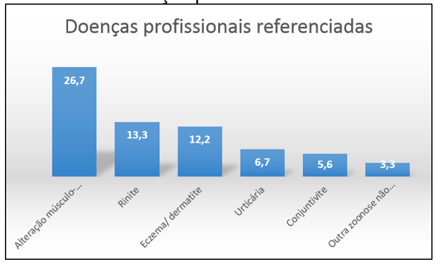 Ninety-one individuals responded and 90 surveys were validated (one was eliminated because of incoherence of responses). The sample consisted mainly of female workers (87.8%), under the age of 30 (53.3%), with little professional experience (53.3% worked for less than 5 years) and predominant profession in veterinary medicine (80.0%). Risk factors include contact with immunoallergenic products, stress, handling of chemicals and biological risk in contact with animals. The use of uniforms and a mask is particularly important for personal protective equipment. The existence of a personal history of occupational accidents is very frequent (93.3%), and animal injuries such as nibbling, scratching or abrasions are very prevalent, followed by bites or cuts with potentially contaminated sharp objects. However, there were few cases where there were functional limitations. At the level of occupational diseases, the musculoskeletal lesions (26.7%) stand out, although only one case has been declared as a suspected occupational disease. Stress emerged as a very frequent phenomenon, affecting almost all workers (96.7%), especially the difficulty in reconciling professional and personal lives (81.1%), wage dissatisfaction (76.7%) and the high workload (73.3%). Finally, it is observed that the majority (63.2%) have a work medicine consultation at least every two years, but only 28.9% perceive the work performed by the Technician of Hygiene and Safety and only 26.7% report having workshops related to their occupational hazards.