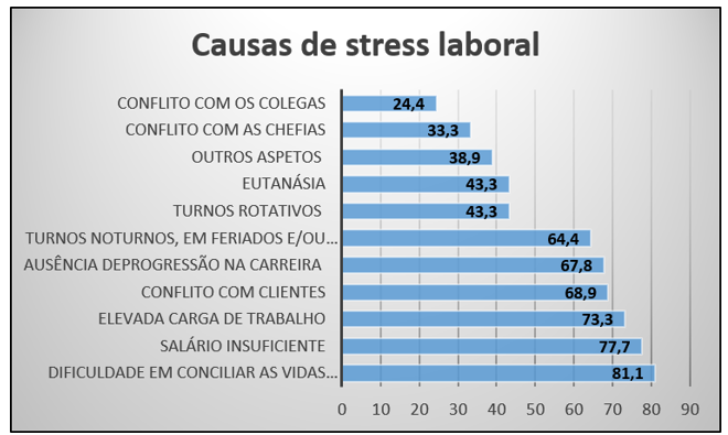 O stress emergiu como um fenómeno muito frequente, atingindo a quase totalidade da amostra (96,7%). A dificuldade em conciliar as vidas, profissional e pessoal (81,1%), a insatisfação salarial (76,7%), a elevada carga de trabalho (73,3%), o conflito com os clientes (68,9%), a ausência de progressão na carreira (67,8%) e a necessidade de realizar turnos noturnos e fins de semana (64,4%) emergiram como os fenómenos mais comuns capazes de induzir stress nos profissionais.