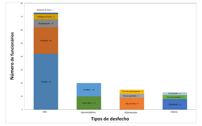 A Figura 1 apresenta a distribuição dos trabalhadores de acordo com os possíveis desfechos dos casos após o acompanhamento. Observou-se que 60% (n=73) destes receberam alta, restando apenas 12% (n=15) em afastamento. Cerca de 16,5% (n=20) dos funcionários não retornaram ao trabalho em decorrência da aposentadoria (reforma), sendo 10 por invalidez e 10 por busca voluntária ou determinação compulsória; e 11,5% (n=13) devido a exoneração do cargo (n=2), determinação de afastamento judicial (n=3) e falecimento (n=8).
