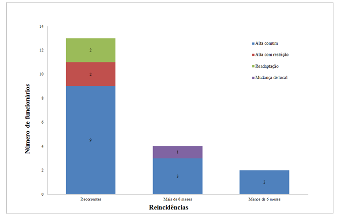 A Figura 2 apresenta os dados relacionados à reincidência após a alta; contudo, 55 (73%) não apresentaram reincidência. O alto índice de efetividade no retorno ao trabalho pode ser explicado pelo acompanhamento por parte da equipa e dos setores envolvidos, conforme já discutido. Outra possível explicação é a colaboração do funcionário no processo de reinserção, já que evidências apontam que o fato do trabalhador estar disposto a retornar ao trabalho e ter esta possibilidade viabilizada através das políticas de reinserção laboral proporciona o sentimento de inclusão social, de utilidade e de capacidade15.
