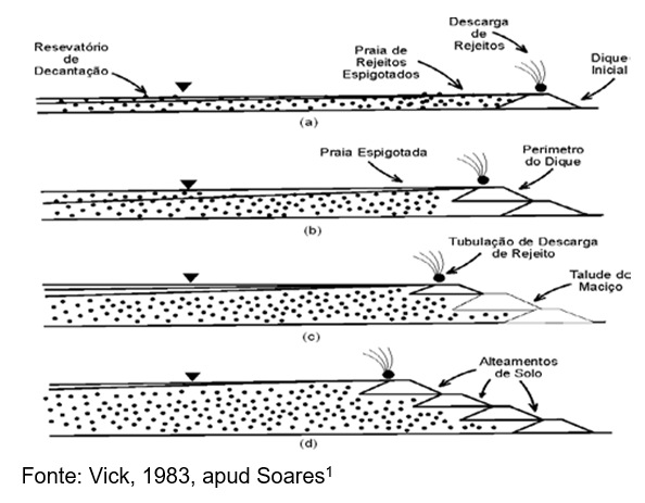 Figura 1. Sequência de alteamento de barragens de rejeito pelo método de montante modificado.