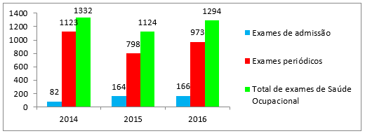 Gráfico 1 – Distribuição do número de exames de Saúde Ocupacional, entre 2014-2016