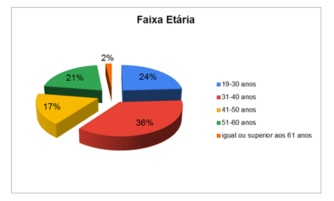 A amostra foi constituída por 56,9% do sexo feminino e 43,1% do sexo masculino, existindo uma maior prevalência da faixa etária dos 31 aos 40 anos (36,2%), seguido dos 19 aos 30 anos (24,1%) e dos 51 aos 60 anos de idade (20,7%), como ilustra a figura 1.