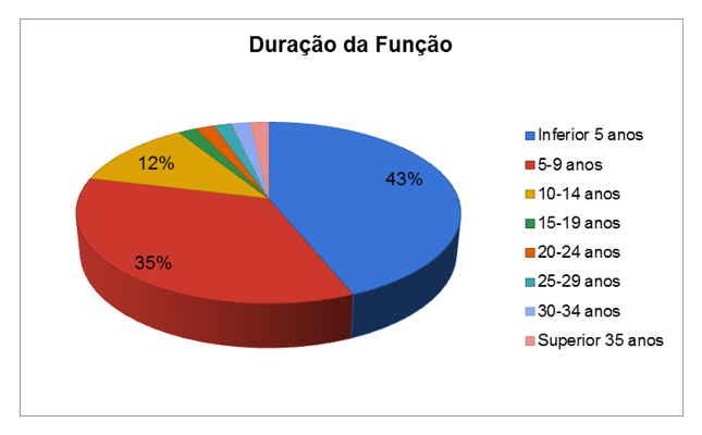 Relativamente às habilitações literárias, verifica-se uma predominância dos mestres (73,7%). Denota-se, relativamente à categoria/ função desempenhada, 38,8% são Técnicos Assistentes (40,4%), seguidos dos Assessores (28,1%) e dos Consultores (19,3%). 43,9% exerce estas funções há menos de cinco anos (Fig.2), estando na instituição em igual período cerca de 25,9%, 22,4% entre os 5-9 anos e 19% entre os 10-14 anos.