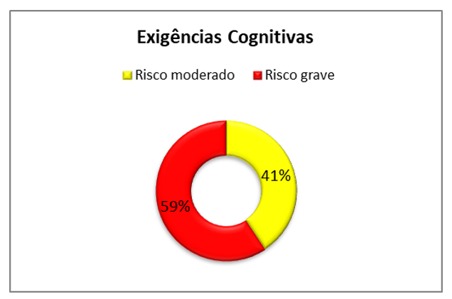 Atendendo à amostra geral, verifica-se que as exigências laborais representam um risco para a Saúde, sendo de destacar um maior impacto das “cognitivas”, representando já um perigo significativo, como ilustra a tabela 1, sendo que 59% da amostra revela risco grave e 41% moderado (fig. 3). Este fator está relacionado com o processo de tomada decisão e o desenvolvimento de novas ideias, conhecimento e capacidade de realizar várias tarefas em simultâneo. É fundamental que a organização disponibilize recursos e oportunidades para o desenvolvimento de novos conhecimentos, para evitar a estagnação no trabalho. No entanto, apesar da literatura considerar que esta variável não apresenta grandes consequências (negativas ou positivas) no âmbito da Saúde (32; 33), pode ser considerada um desafio, permitindo aumentar a motivação, comprometimento e satisfação, evitando trabalhos monótonos e rotineiros (34).