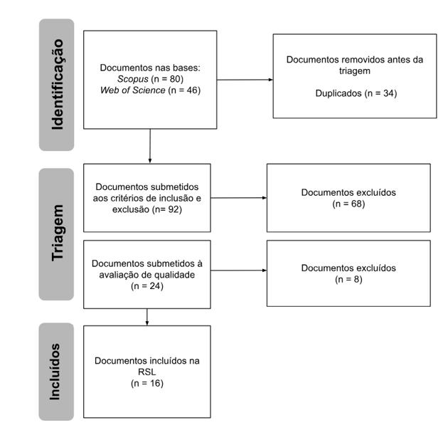 A Figura 1 demonstra a aplicação das etapas anteriores até a seleção final dos documentos selecionados para extração dos dados. Após a aplicação da avaliação de qualidade, oito documentos foram recusados e, portanto, 16 foram levados para a etapa de extração e leitura aprofundada dos conteúdos.