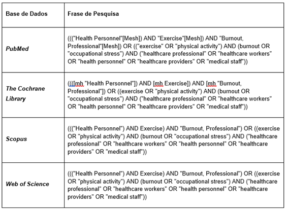 A estratégia de pesquisa baseou-se na utilização combinada de termos Mesh ou equivalente ((“Health Personnel”[Mesh]) AND “Exercise”[Mesh]) AND “Burnout, Professional”[Mesh]) e de descritores livres ((“healthcare professional” OR “healthcare workers” OR “health personnel” OR “healthcare providers” OR “medical staff”) AND (“exercise” OR “physical activity”) AND (burnout OR “occupational stress”)). A frase completa de pesquisa para as diferentes bases de dados pode ser consultada no Quadro 1.