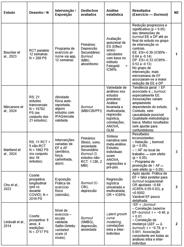Foram incluídos cinco artigos: um ensaio clínico controlado e randomizado, duas revisões sistemáticas e dois estudos de coorte. A globalidade dos estudos mostrou associação entre a prática regular de exercício físico e taxas mais baixas de burnout. Dois estudos mostraram um efeito de gradiente, com uma incidência de burnout cada vez menor, ou uma melhoria das suas dimensões mais acentuada, quanto mais exercício fosse realizado.