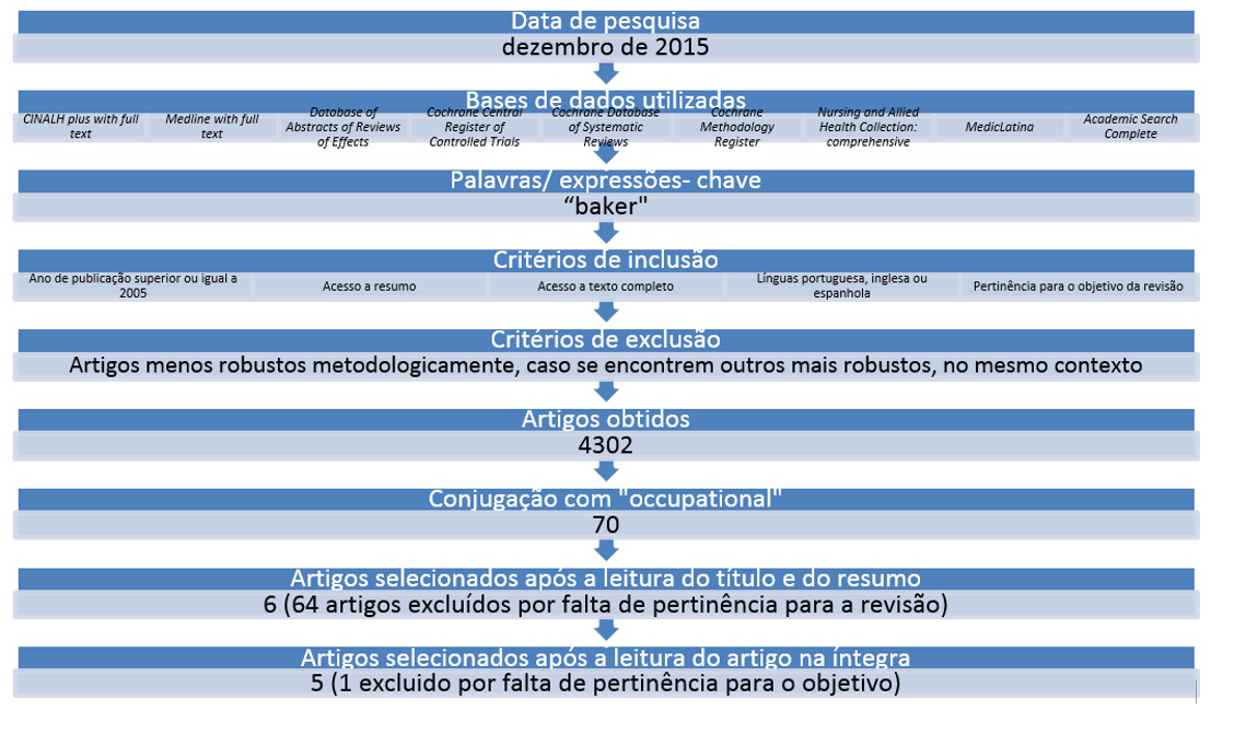Foi realizada uma pesquisa bibliográfica em dezembro de 2015 nas bases de dados “CINALH plus with full text, Medline with full text, Database of Abstracts of Reviews of Effects, Cochrane Central Register of Controlled Trials, Cochrane Database of Systematic Reviews, Cochrane Methodology Register, Nursing and Allied Health Collection: comprehensive, MedicLatina e Academic Search Complete”. Utilizando a palavra-chave “baker” foram obtidos 4302 artigos, com os critérios publicação igual ou superior a 2005 e acesso a texto completo; conjugando tal com a palavra-chave “occupational”, obtiveram- se 70 artigos; em função da língua original (portuguesa, inglesa ou espanhola) e da pertinência para o objetivo desta revisão, foram selecionados seis após a leitura do resumo e, após a consulta do trabalho na íntegra, manteve-se o interesse em cinco desses artigos.