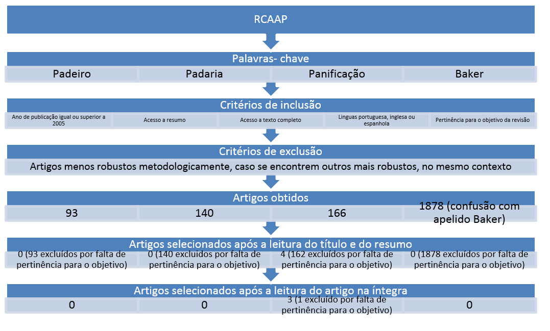 Contudo, como praticamente não se encontram estudos relativos à realidade portuguesa nestas bases de dados indexadas, os autores procuraram trabalhos inseridos no RCAAP (Repositório Científico de Acesso Aberto em Portugal). Aqui, utilizando as palavras-chave “padeiro, padaria, panificação e baker”, foram obtidos 93, 140, 166 e 1878 documentos; após a leitura do resumo dos mesmos foram selecionados 0, 0, 4 e 0 trabalhos, com a leitura do resumo; após a consulta na íntegra manteve-se o interesse em três trabalhos.