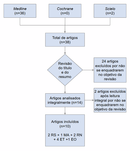 A pesquisa bibliográfica permitiu identificar 38 artigos potencialmente relevantes. Após a triagem inicial dos títulos e resumos, 24 foram excluídos por não cumprirem os critérios de inclusão previamente estabelecidos. Os 14 artigos remanescentes foram avaliados na íntegra, tendo sido excluídos quatro por não abordarem diretamente os desfechos de interesse ou por apresentarem limitações metodológicas significativas. Assim, dez estudos foram incluídos na análise final. O processo de seleção encontra-se representado na Figura 1, conforme fluxograma adaptado do modelo PRISMA.